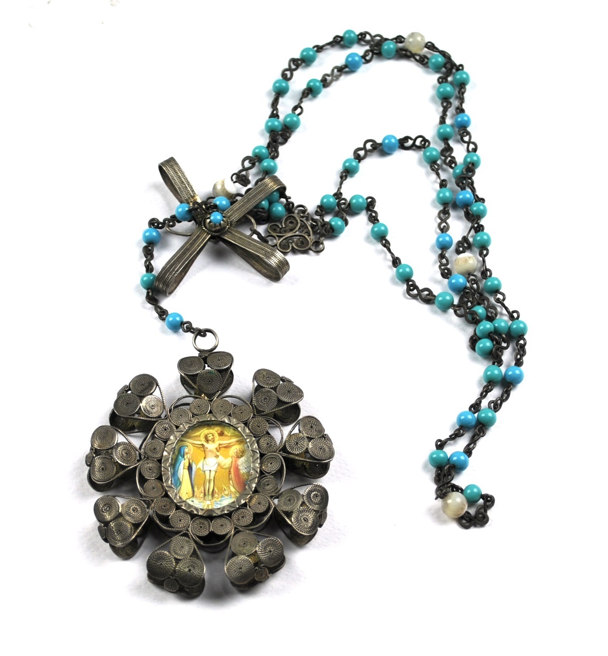 Riproduzione del rosario della tradizione sarda, realizzato artigianalmente in Sardegna con la tecnica della filigrana. Il rosario è realizzato in argento 925 % anticato. Nella parte centrale rappresentazioni iconografiche religiose.